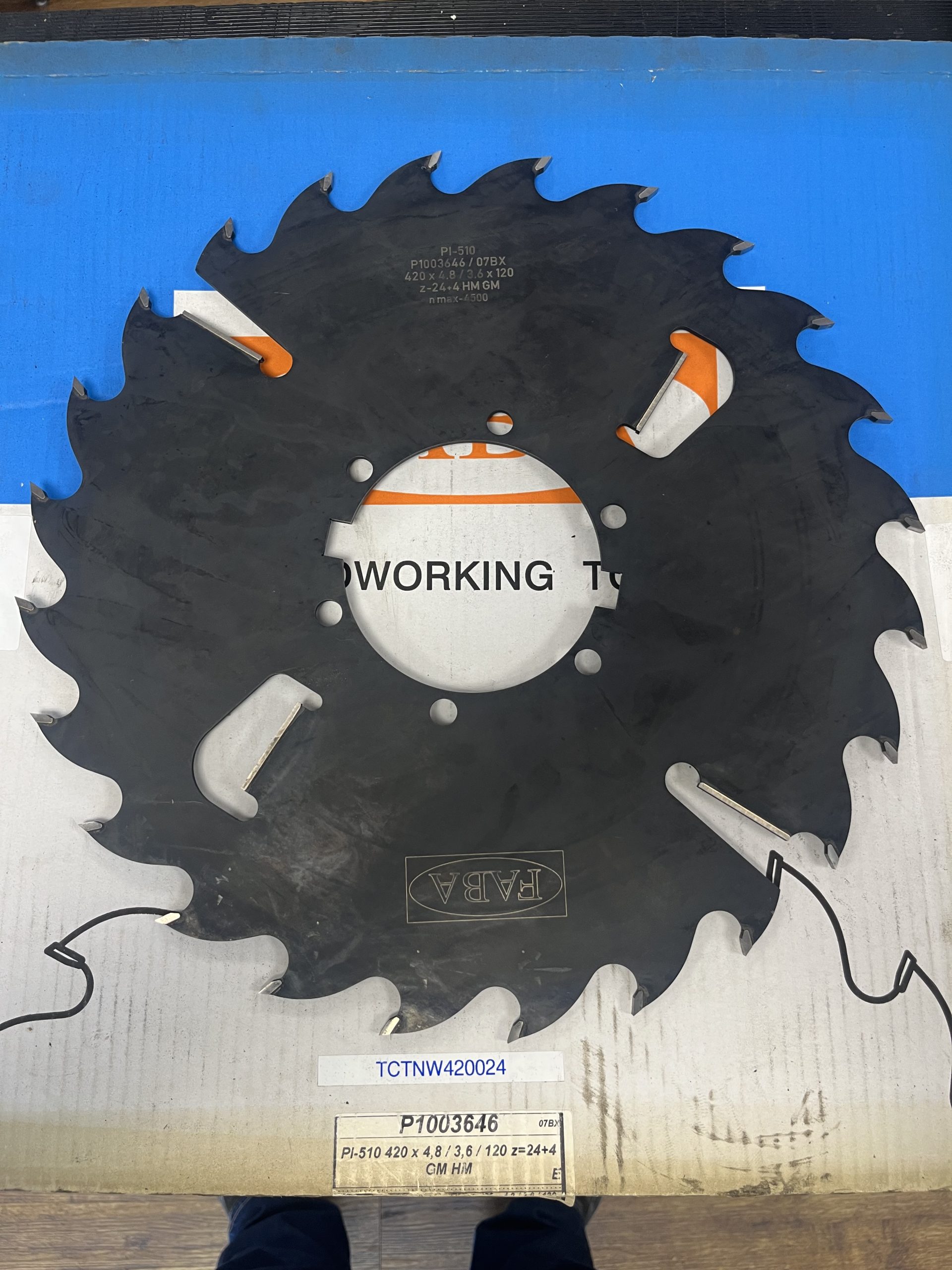 Industrial TCT circular saw blade 420mm diameter with 24 teeth and 4 wipers for efficient cutting.
